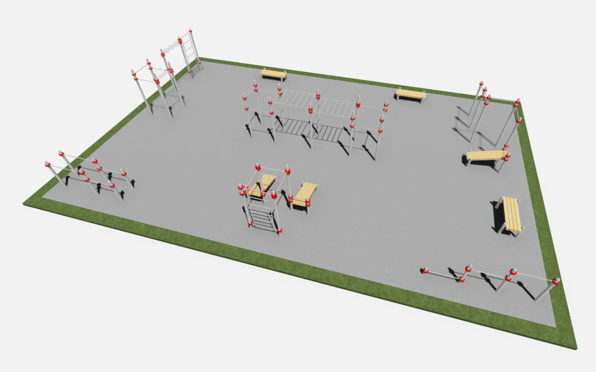 Спортивная площадка включает тренажеры: СК001 – 3 шт., СК003, РК002, Ш004, Т005, Б003, СК019.