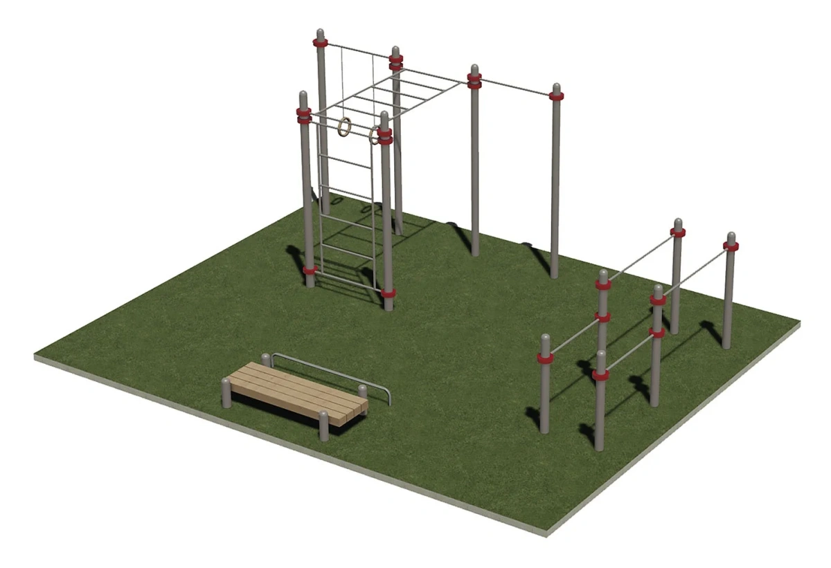 Комплектация: Спортивная площадка включает тренажеры: РК036, СК0017 и Б003.
