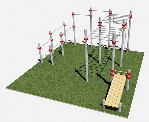 Два турника, брусья двойные разноуровневые, шведская стенка, рукоход разноуровневый и скамья для пресса.