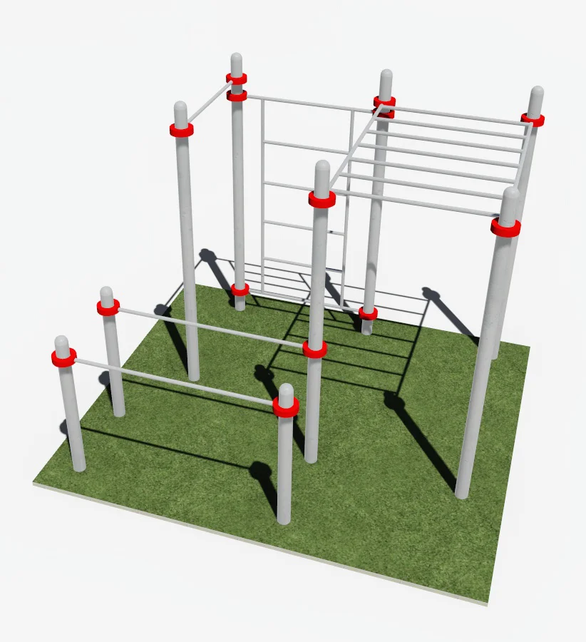 • Опорные столбы брусьев высотой 1500 мм в количестве 2 единиц, 2 горизонтальные перекладины длиной 1500 мм, расположенныу на высоте 1300 мм от поверхности основания.