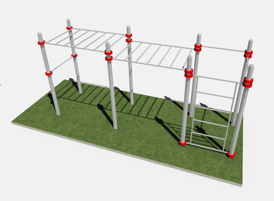 Комплекс состоит из восьми вертикальных опорных столбов высотой 2600 мм. Составляющими данного комплекса являются два разноуровневых рукохода, шведская стенка и четыре перекладины.