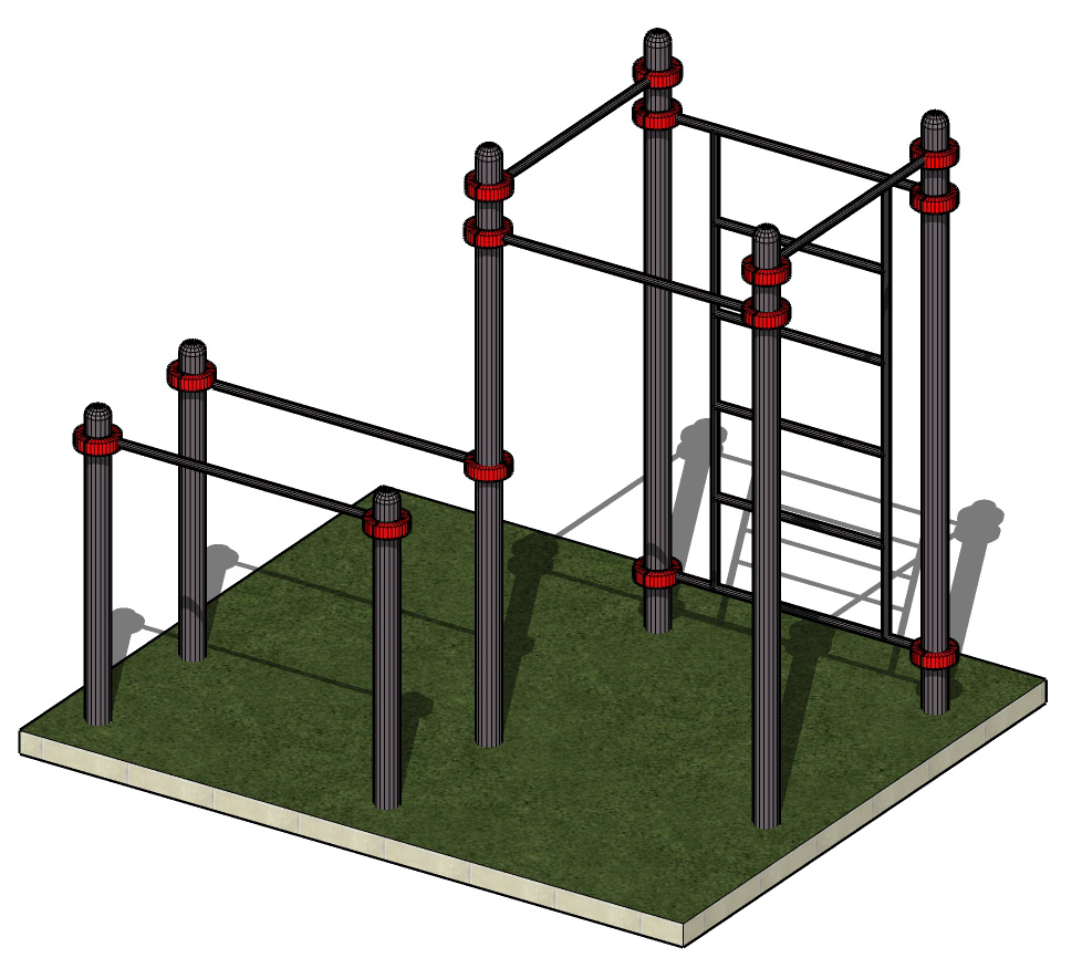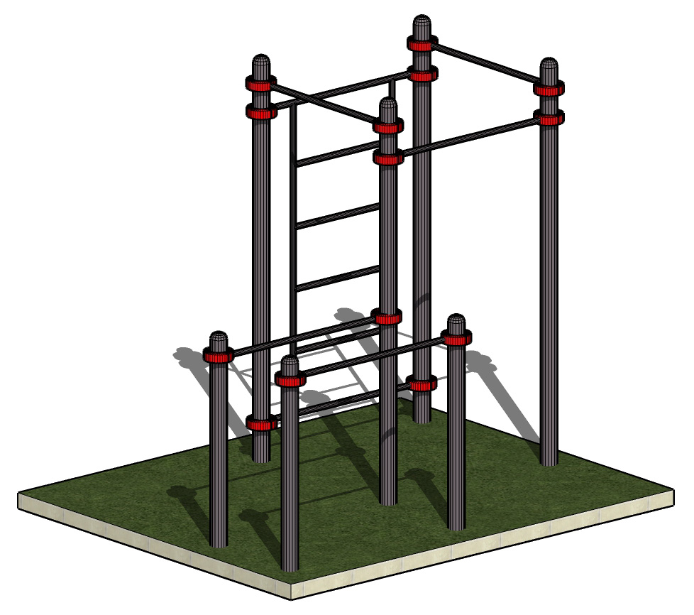 К опорным столбам высотой 2600мм крепятся с помощью хомутов на высоте от уровня основания: 2450 мм, 2350 мм, 2200 мм – перекладина туника шириной 1200 мм. Перекладины брусьев размером 1500 мм крепятся на высоте 1400 мм с помощью хомутов. Шведская стенка крепится к опорным столбам на высоте 2550 мм, размер шведской стенки 1200*2070 мм.