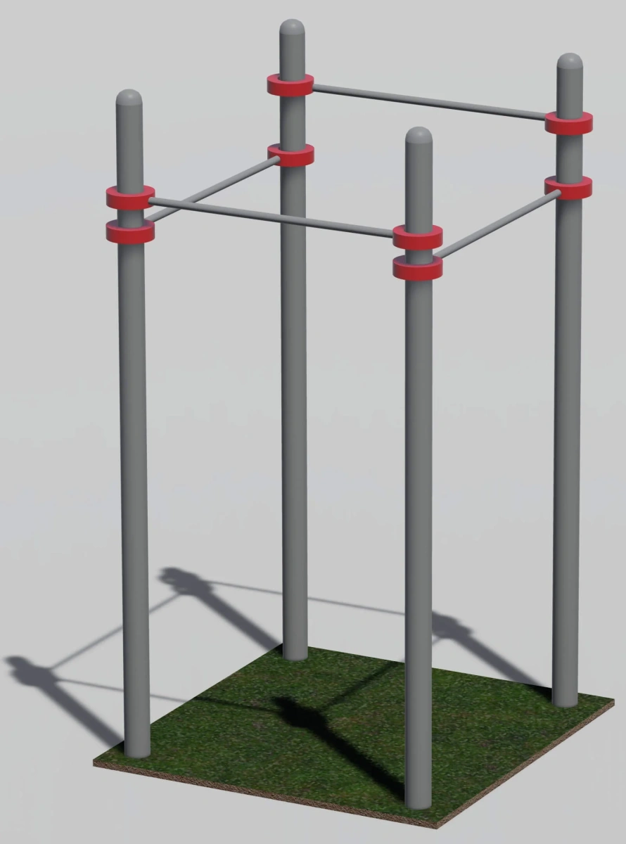 Опорные стойки высотой 2600мм, в количестве четырех штук. Перекладины длиной 1200мм, четыре штуки, крепятся к опорным столбам при помощи стальных хомутов. Высоту перекладин можно регулировать.