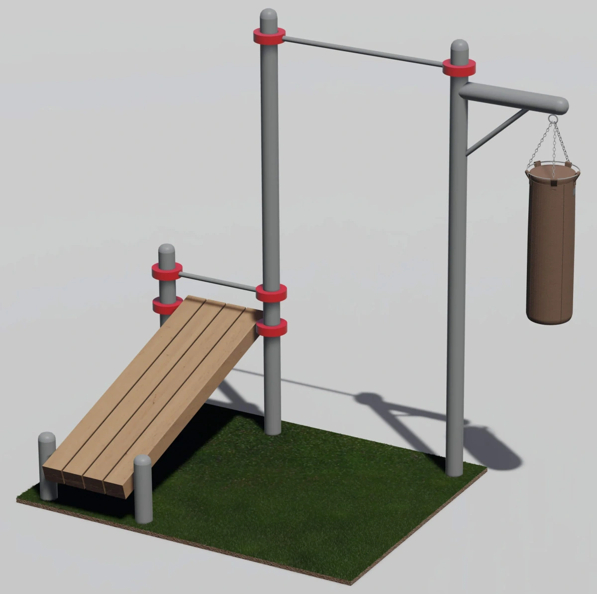 Перекладина турника для подтягиваний крепится на высоте 2500 мм от уровня основания к опорным столбам высотой 2600 мм. Крепление элементов данного комплекса осуществляется при помощи хомутов. Сварной каркас у кронштейна служит для подвешивания боксерского мешка. Размер выноса - 600мм. Высота фиксации скамьи составляет: 1100 мм и 400 мм от уровня основания и осуществляется к опорным столбам высотой 1шт. – 2600мм, 1шт. – 1500мм и 2 шт.- 500 мм. Перекладина для фиксации ног крепится на высоте 1300 мм от поверхности основания. Лавка представляет собой деревянный брус размером 450мм*1800мм сечением 140*50 мм.